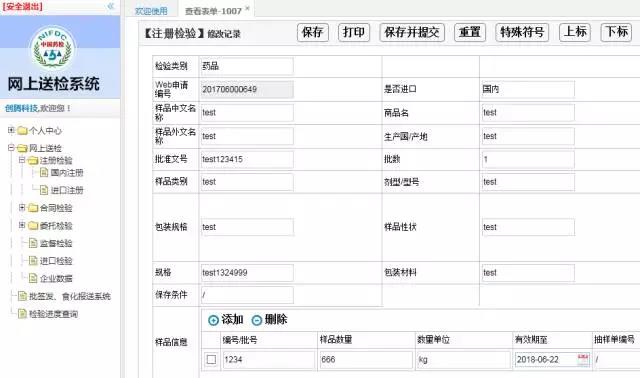 在弹出页面,填写相关的检品信息,填写完毕点击“保存”,需要打印检品信息,点击“打印”按钮,最后点击“保存并提交”,样品信息提交到系统,等待审核。