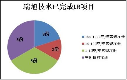 截止目前,瑞旭技术共完成15个LR项目,包括3个100-1000吨/年的常规注册,2个10-100吨/年的常规注册,5个1-10吨/年的常规注册以及5个中间体的注册,囊括了目前为止的所有注册类型。