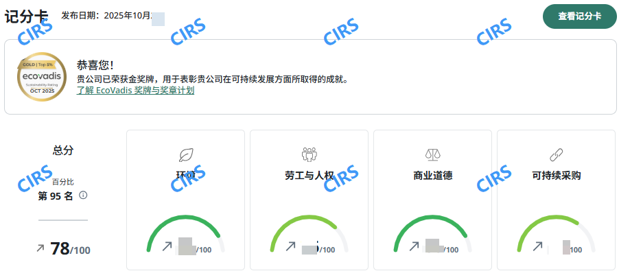 10月28日,瑞旭集团辅导的某化工行业客户凭借其卓越的综合表现在最新一轮EcoVadis评估中以78分跻身全球参评企业的前5%,获得EcoVadis金牌。