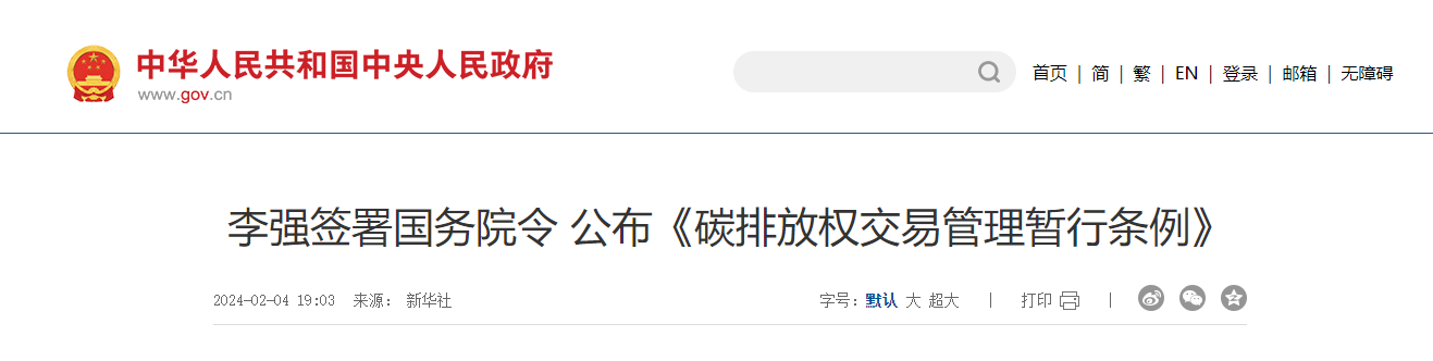 据新华社北京2月4日报道,国务院总理李强日前签署国务院令,公布《碳排放权交易管理暂行条例》(以下简称《条例》),自2024年5月1日起施行。