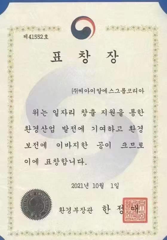 2021年10月19日,韩国环境部授予瑞旭集团韩国子公司(CIRS Korea)“环境产业领域优秀企业”荣誉,并举行优秀企业表彰仪式。