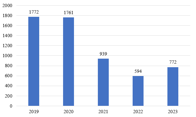 Figure 1 illustrates the number of registered chemical fertilizers from 2019 to 2023. Notably, 2019 witnessed the highest number of registrations, totaling 1,772. Conversely, 2022 recorded the lowest number of registrations, with a mere 594 during to regulation change. However, in 2023, the number of registrations rebounded significantly to reach 772, indicating a notable 30% increase compared to the previous year.