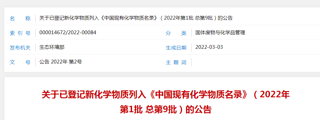 3 March 2022, China MEE announced that the ninth batch of 18 substances have fulfilled the requirements for IECSC supplementation and will be managed as existing chemical substances.