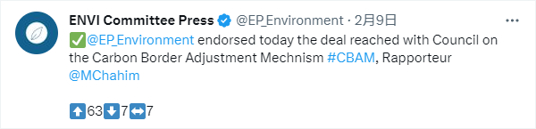 On February 9, the Environment, Public Health and Food Safety (ENVI) Committee tweeted that it has endorsed the Carbon Border Adjustment Mechanism (CBAM), a measure aimed at responding to climate change and preventing carbon leakage, with 63 votes in favor, 7 votes against and 7 votes in abstention.