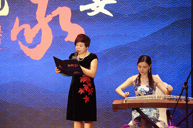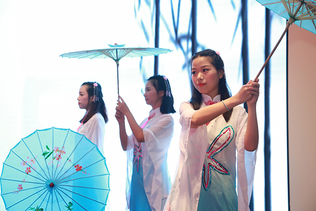 Then, employees from CIRS perform a beautiful umbrella dance. Eight girls hold paper umbrellas and dance on the stage, revealing unique ambience of Hangzhou.