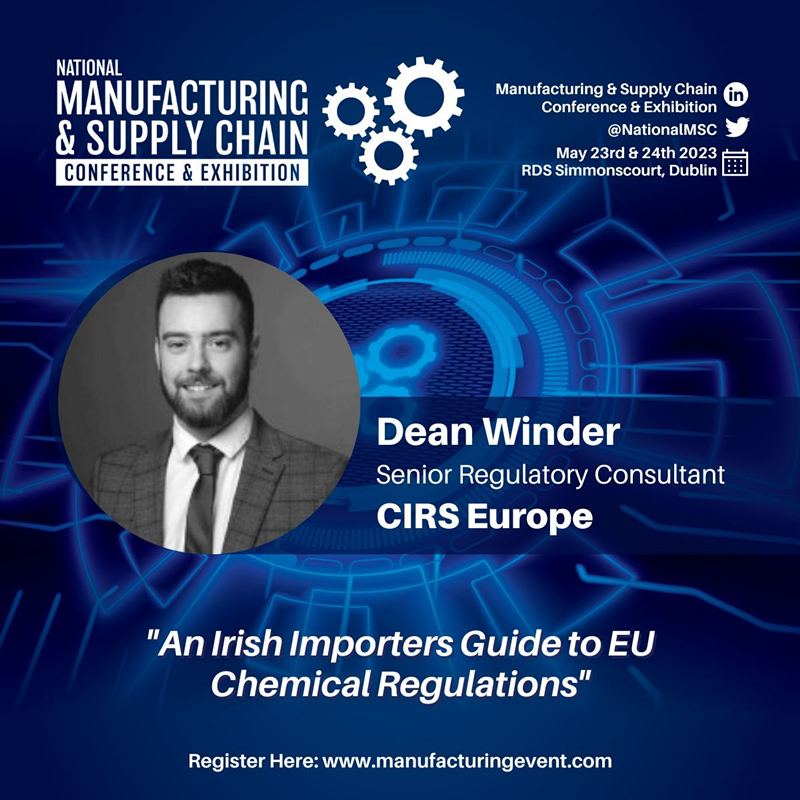 We're delighted to announce that Dean Winder, Senior Regulatory Consultation at CIRS Europe, will be speaking at the National Manufacturing and Supply Chain Conference & Exhibition in the RDS Simmonscort in Dublin.