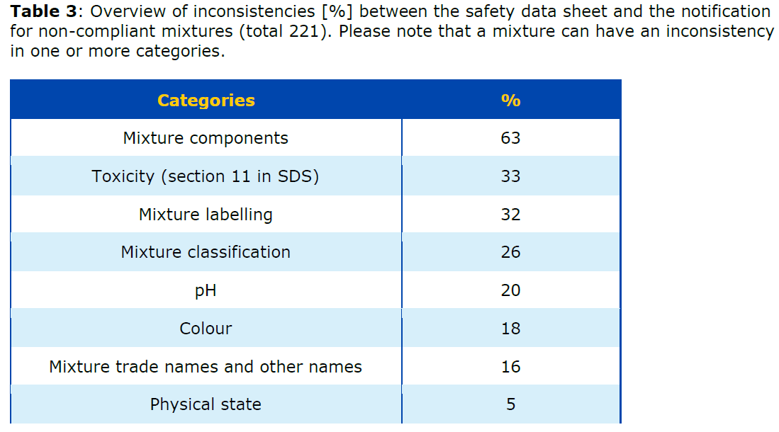 3 | The Member State's appointed body calculated the mixture's ATE value based on the toxicological data of components reported in the toxicological information, and compared the calculation result with the mixture classification. | The ATE value indicates the mixture falls under Acute Tox. 3 (oral), while the company classified it as Acute Tox. 4 (oral) – a discrepancy requiring correction of the mixture classification. |
