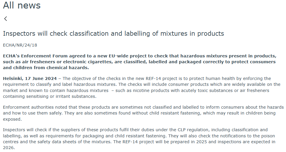 If the current ECHA enforcement pilot represents a "trial run," the upcoming REF-14 project marks the phase of "full-scale implementation." Launched in 2025 with inspections conducted this year, REF-14 aims to enforce the classification and labeling of hazardous mixtures, covering consumer products widely available on the market and known to contain hazardous mixtures. Inspections also include notifications submitted to poison centres and mixture SDS.