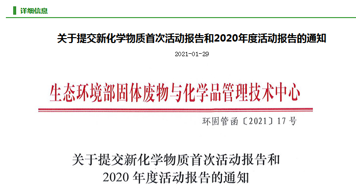 29 Jan. 2021, China Solid Waste and Chemicals Management Center released the notification to submit first activity report and annual report. Under the requirements of revised Provisions on Environmental Administration of New Chemical Substances (MEE Order No. 12), certificate holders of simplified registration and regular registration under MEE Order No. 12 need to report their first activity within 60 days from the date of first manufacturing or import. Certificate holders of hazardous new chemical substances under priority environmental management need to report their manufacturing and import status of 2020