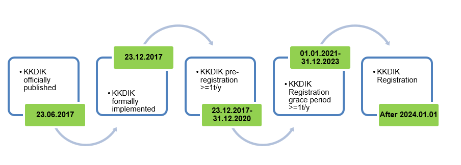 - KKDIK was officially published on 23 Jul. 2017 and came into effect on 23 Dec. 2017. Preregistration obligations apply to substances manufactured or imported in quantities of one tonne or more per year per manufacturer or importer. The deadline of pre-registration is 31 Dec. 2020.