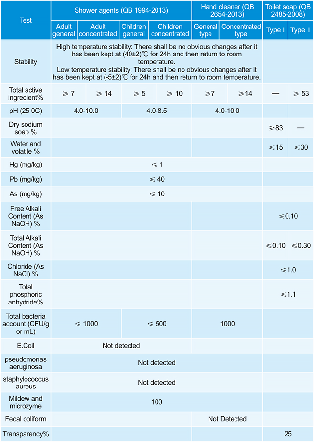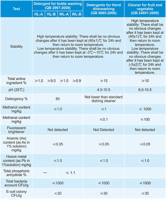When food related detergents are manufactured or sold in China, they shall be tested to prove the product quality is over the national standard. As GB14930.1-2015 - National Food Safety Standard-Detergent required, the food related cleaner should conduct following testing in China qualified/certified laboratories: