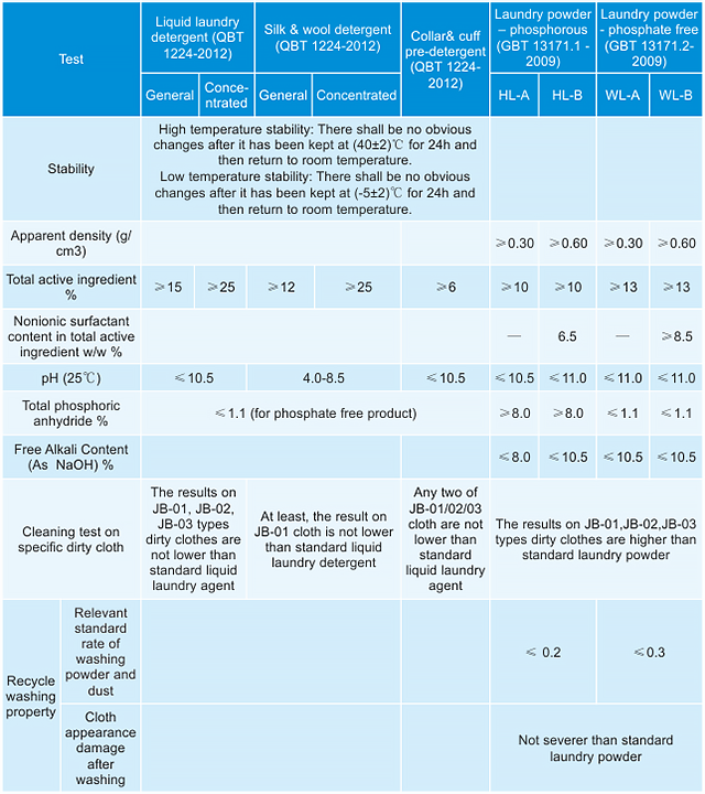 In China, detergents/cleaners should comply with various standards, including China national standard (GB) and industrial standard (QB). The amount of detergent standards exceeds twenty, but not required to comply with all standards. Due to cleaning categories (A, B and C.) and product functions, appropriate national standards and industrial standards could be identified. Detergents/cleaners company can conduct testing as standard required to evidence their product comply with the GB or QB.