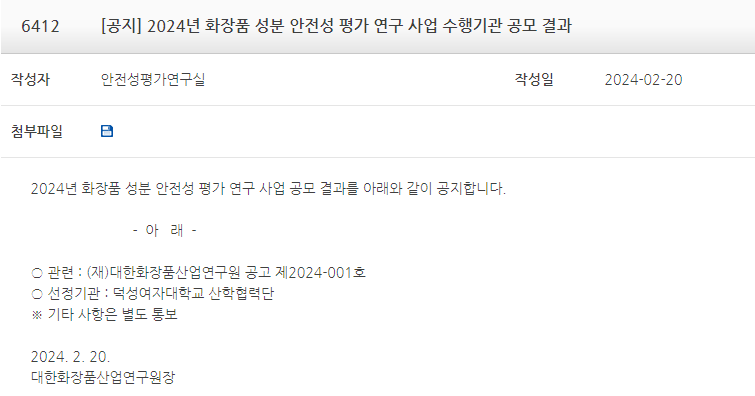On February 20, 2024, according to the announcement No. 2024-001 by the Korea Cosmetic Industry Institute (KCII), CIRS Group Korea, a subsidiary of CIRS Group, together with the Risk Management Research Institute Co., Ltd. and Duksung Women's University, was designated as the executing agency for the KCII’s 『2024 Cosmetic Ingredient Safety Evaluation Research Project』 in the name of the Duksung Women's University Industry-Academic Cooperation Foundation.