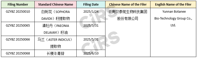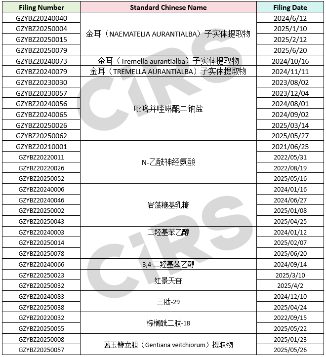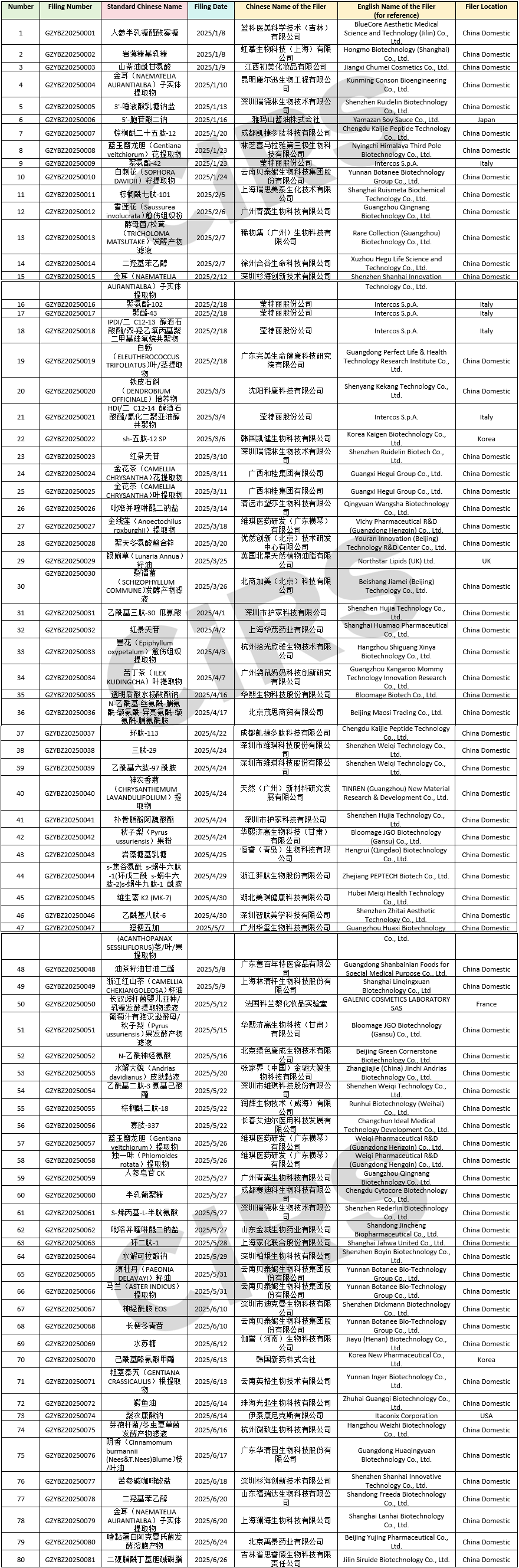 According to data from the NMPA, a total of 80 new cosmetic ingredients were filed in the first half of 2025. As of now, the relevant technical specifications for these ingredients have not yet been disclosed, and none have entered the mandatory monitoring period. This figure is close to the total number of filings for the entire year of 2024, indicating a significant surge in filings during the first half of 2025. For detailed information, please refer to Table 1 below.