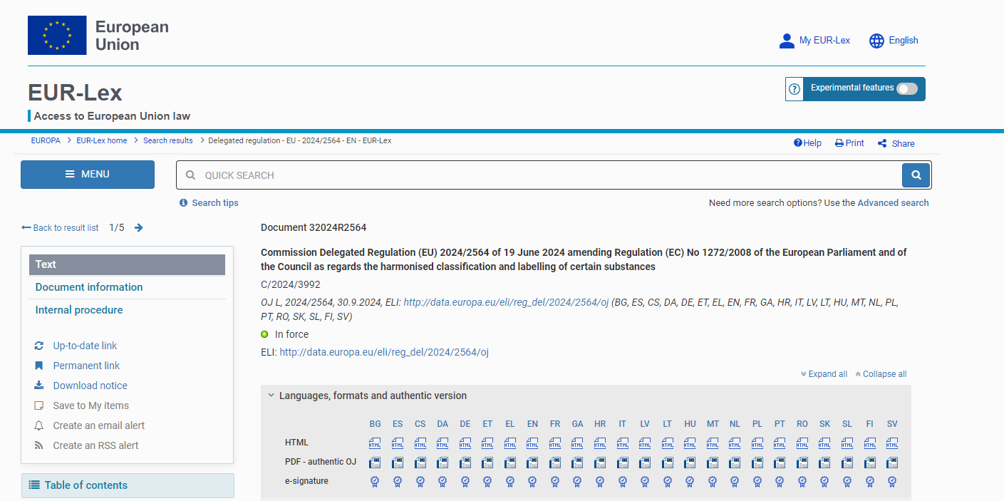 This amendment primarily concerns CMR substances classified as Category 1A, 1B, or 2 under Regulation (EU) 2024/2564. In September 2024, the European Commission published Commission Delegated Regulation (EU) 2024/2564 of June 19, 2024, which amends the Classification, Labelling and Packaging (CLP) Regulation. The amendment mainly updates the harmonized classification and labelling list in Part 3 of Annex VI to the CLP Regulation, covering substances such as Sodium Perborate (CAS No. 7632-04-4) and Silver (CAS No. 7440-22-4). This amendment will enter into force on May 1, 2026.