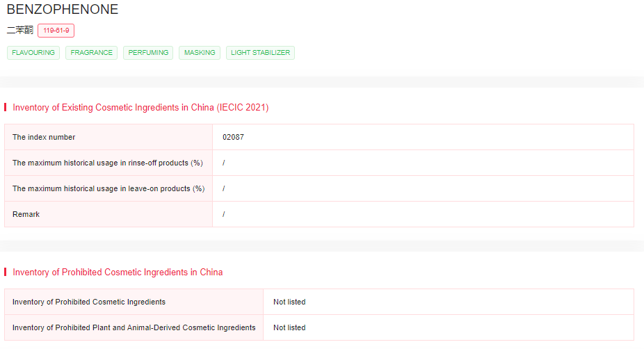 Benzophenone | 119-61-9 | Inventory of Existing Cosmetic Ingredients in China (IECIC 2021) |