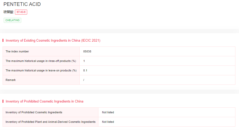Ncarboxymethyliminobis(ethylenenitrilo)tetra(a cetic acid); Pentetic Acid (INCI) | 67-43-6 | IECIC 2021 |