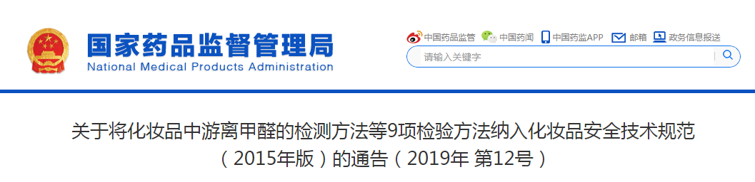 On 22nd Mar, 2019, NMPA issued a Notice No.12 regarding 5 new testing methods added and 4 testing methods revised to Safety and Technical Standards for Cosmetics (2015). The 5 new testing methods are Determination of Free Formaldehyde in Cosmetics, Short Time Exposure In Vitro Test Method (STE), Skin Sensitization: Local Lymph Node Assay: DA (LLNA:DA), Skin Sensitization: Local Lymph Node Assay: BrdU-ELISA (LLNA:BrdU-ELISA) and In Chemico Skin Sensitisation: Direct Peptide Reactivity Assay (DPRA). The 4 revised testing methods are Determination of Cantharidin and Chlormethine in Cosmetics, Determination of 10 α-hydroxy acid in cosmetics, Bacterial Reverse Mutation Assay and Teratogenicity Test. From 1st Jan 2020, these testing methods will be available to testing of cosmetics registration/filing and post market surveillance.