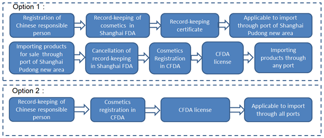 Imported non-special use cosmetics | Pudong New Area and others | YES | Offline | Option 1: Record-keeping in Shanghai FDA at first. Then cancelling the record-keeping in Shanghai FDA before CFDA registration. Finally applying for CFDA registration. Option 2: Registration in CFDA |