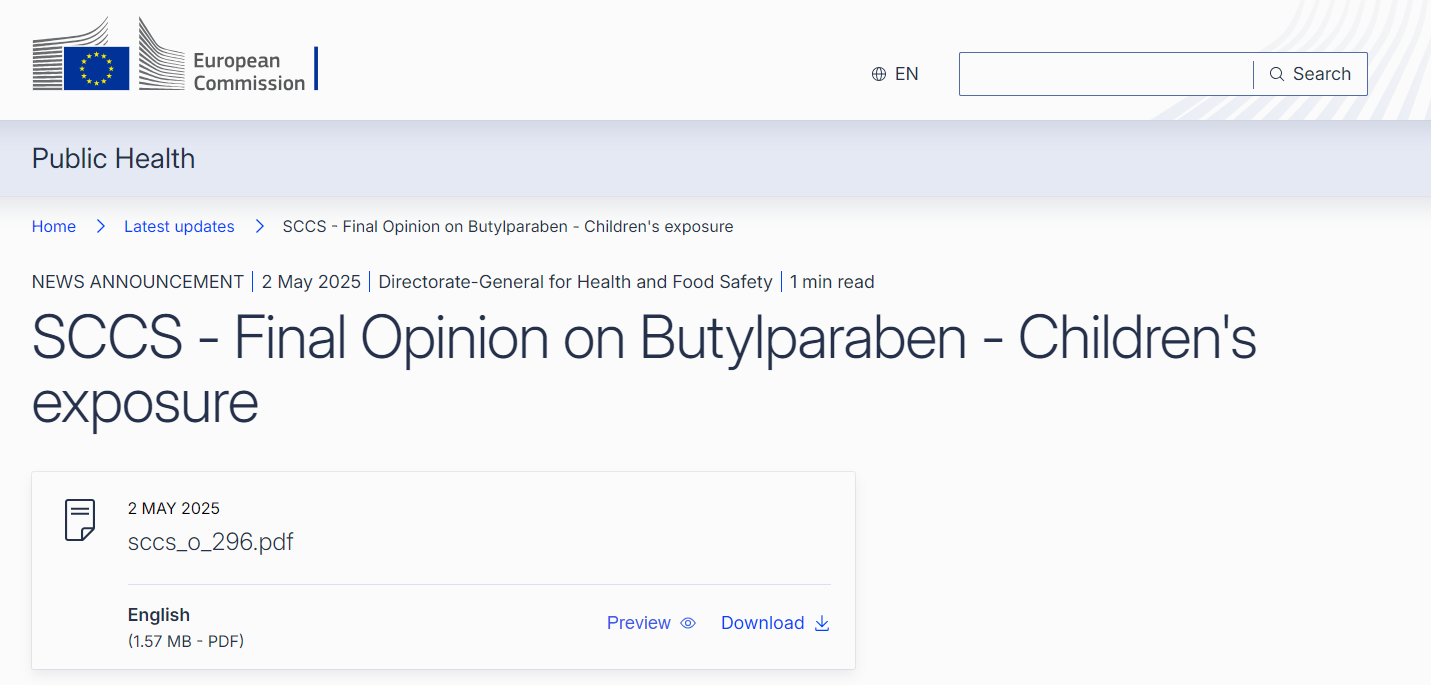 On May 2, 2025, the Scientific Committee on Consumer Safety (SCCS) of the European Union issued a final opinion (SCCS/1674/25) on Butylparaben (CAS No. 94-26-8). The preliminary opinion was issued on January 13, 2025.