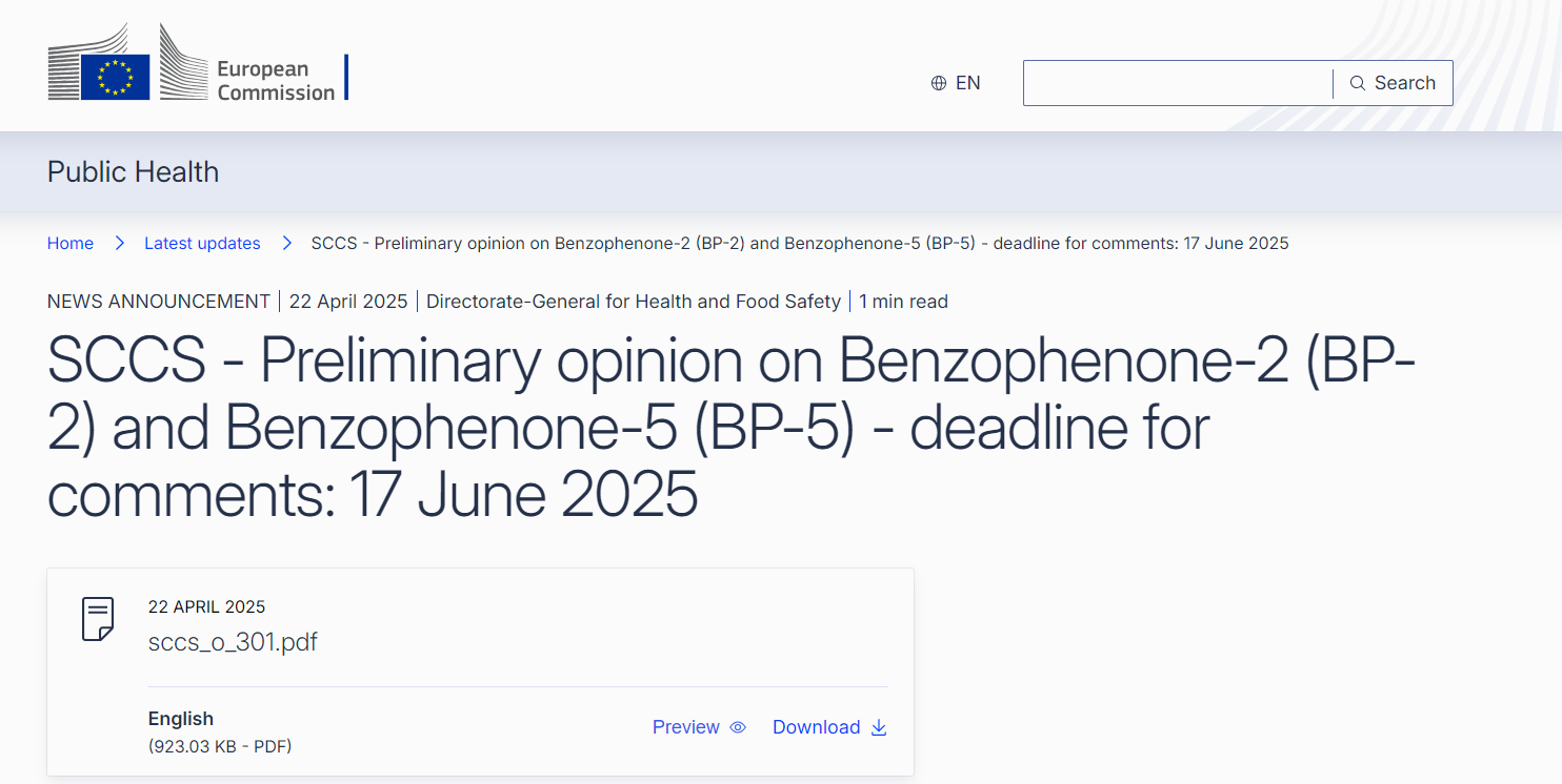 On April 22, 2025, the Scientific Committee on Consumer Safety (SCCS) of the European Union issued preliminary opinion (SCCS/1679/25) on Benzophenone-2 (BP-2) (CAS No. 131-55-5) and Benzophenone-5 (BP-5) (CAS No. 6628-37-1). The deadline for comments is set for June 17, 2025.