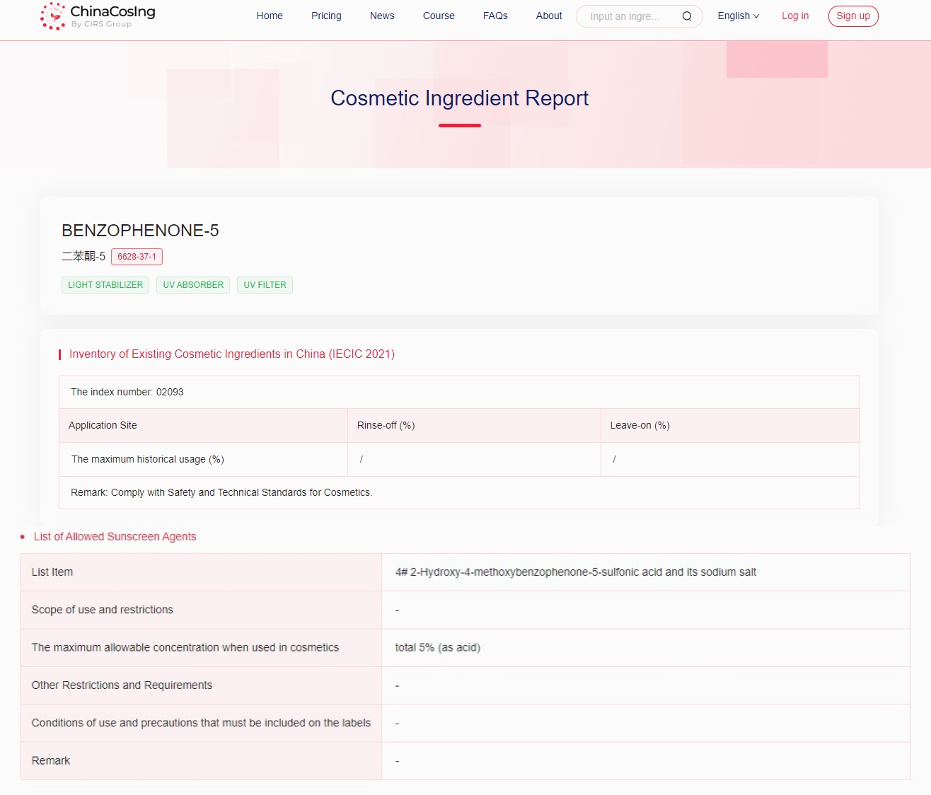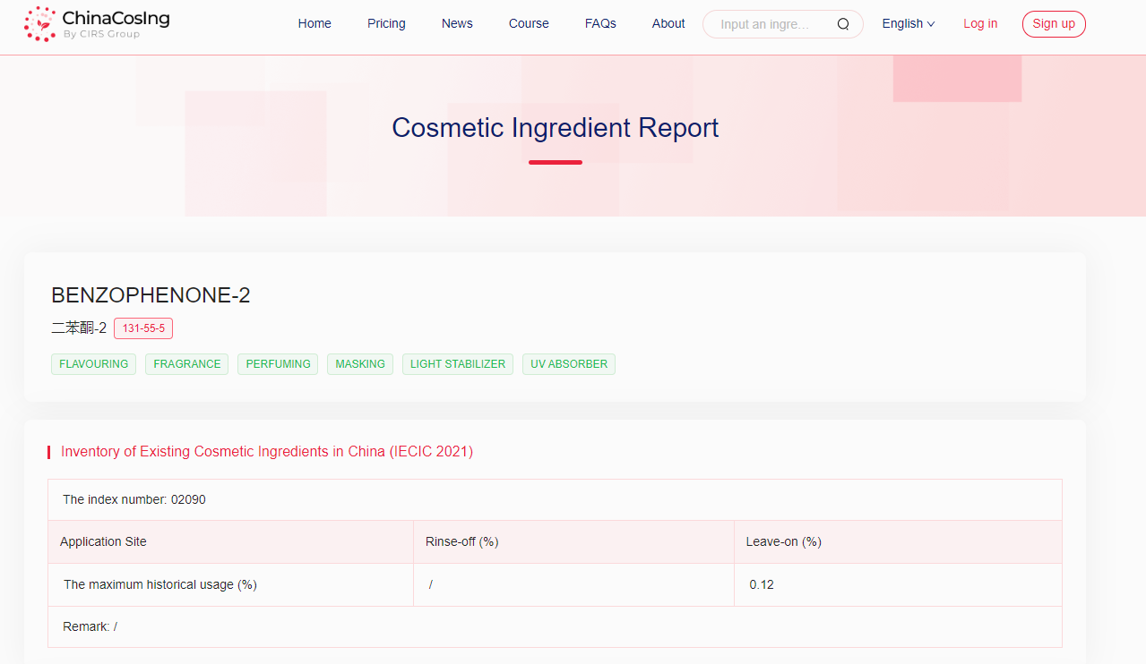 Benzophenone-2: The Chinese Cosmetic Ingredient Regulatory Database (ChinaCosIng), independently developed by CIRS Group, indicates that Benzophenone-2, used as flavoring, fragrance, perfuming, masking, light stabilizer, UV absorber, has been included in the "Inventory of Existing Cosmetic Ingredients in China" (IECIC) (2021 edition) with the maximum historical usage in leave-on products being 0.12%.