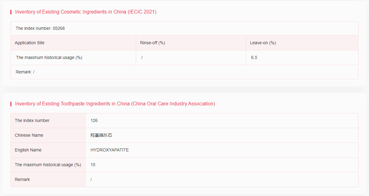 Hydroxyapatite (nano) has been included in the Inventory of Existing Cosmetic Ingredients in China (IECIC 2021), with the maximum historical usage in leave-on products of 6.5% and the Inventory of Existing Toothpaste Ingredients in China (China Oral Care Industry Association) with the maximum historical usage of 15%.
