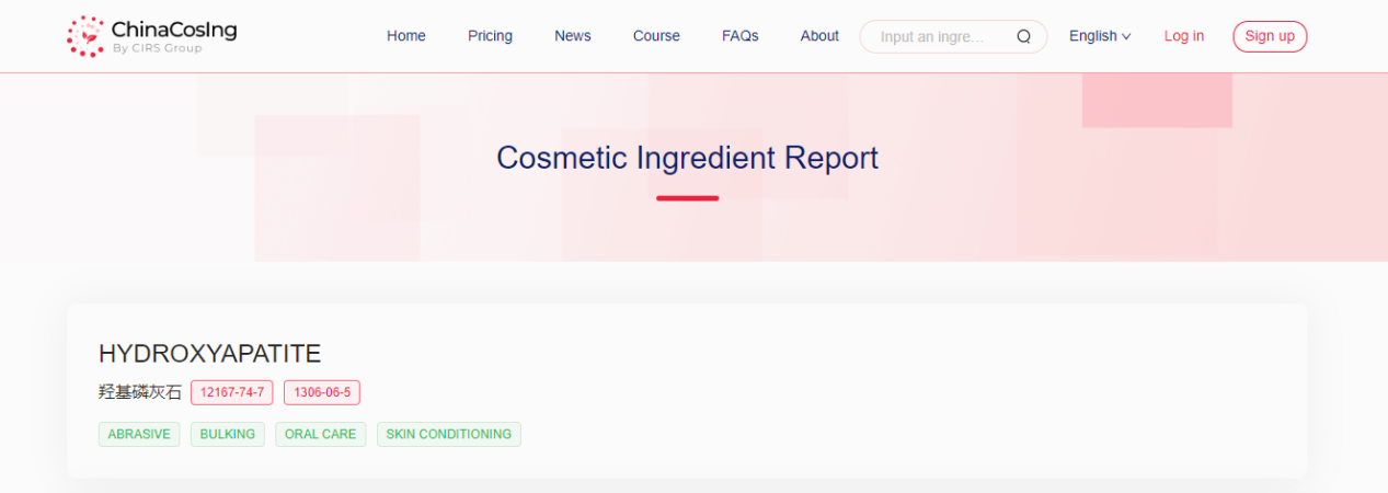 The Chinese Cosmetic Ingredient Regulatory Database (ChinaCosIng), independently developed by CIRS Group, indicates that Hydroxyapatite (nano) (CAS No. 1306-06-5) is used for abrasive, bulking, oral care, or skin conditioning in cosmetics.