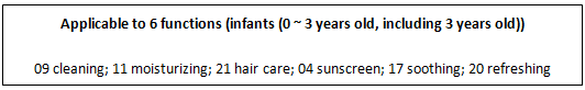 Note: according to the Classification Rules and Catalogue of Cosmetics, the following effects are claimed for cosmetics suitable for children: