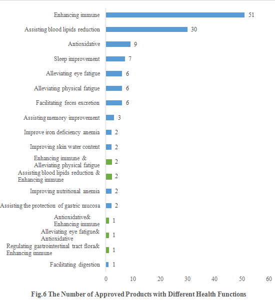 Except for those new products with single health function, there are also 7 products approved with two health functions (shown in green). The health functions of the 7 products are enhancing immune & alleviating physical fatigue, assisting blood lipids reduction & enhancing immune, antioxidative & enhancing immune, alleviating eye fatigue & antioxidative and regulating gastrointestinal tract flora & enhancing immune.