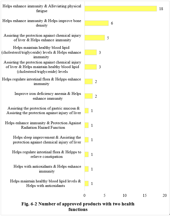 As shown in Fig.6-2, 45 products applied for two health functions in the total new product approvals in 2023. The predominant category was health food claiming enhancing immunity and relieving physical fatigue, totaling 18 products, accounting for 40% of this category.