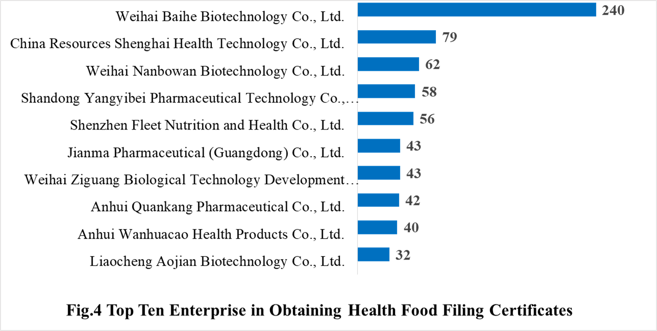 In 2021, 384 domestic health food manufacturers obtained health food filing certificates. Weihai Baihe Biotechnology Co., Ltd. has the largest number of filings, and a total of 240 products obtained the filing certificates, followed by China Resources Shenghai Health Technology Co., Ltd. and Weihai Nanbowan Biotechnology Co., Ltd. with the number of 79 and 62, respectively.