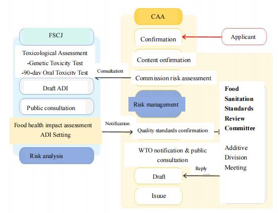 In Japan, only food additives approved under the Food Sanitation Act are permitted for use. An application must be submitted to the CAA when a new food additive is intended to be used in foods; or the scope of permitted foods for an existing food additive is proposed to be expanded. The application is reviewed by the FSCJ for safety evaluation. After the evaluation, the CAA makes the regulatory decision. The additive may be used in food only after the CAA promulgates the relevant regulation.