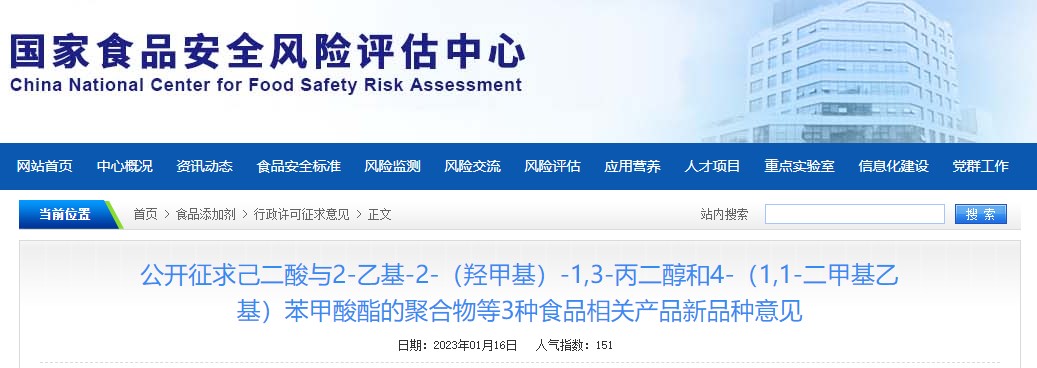 On January 16, 2023, China National Center for Food Safety Risk Assessment (CFSA) issued 3 new food contact additives and resins passing the technical review of the CFSA Expert Review Committee for public comments. The deadline for public comments is February 10, 2023.