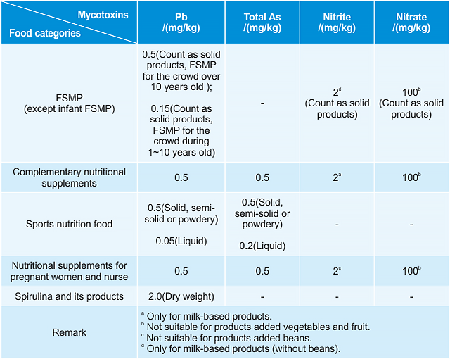 II. Adds the maximum levels of mycotoxins in formula food for special medical purpose (hereinafter referred to as FSMP), complementary nutritional supplements, sports nutrition food and nutritional supplements for pregnant women and nurse.