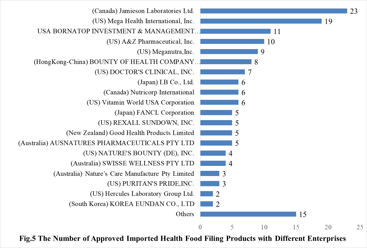 35 oversea companies have got health food filing certificates, Jamieson Laboratories Ltd. has got the largest number of filing certificates (23). Mega Health International, Inc. ranks the second place with the number reaching 19, followed by USA BORNATOP INVESTMENT & MANAGEMENT CO., LTD, which numbered 11.
