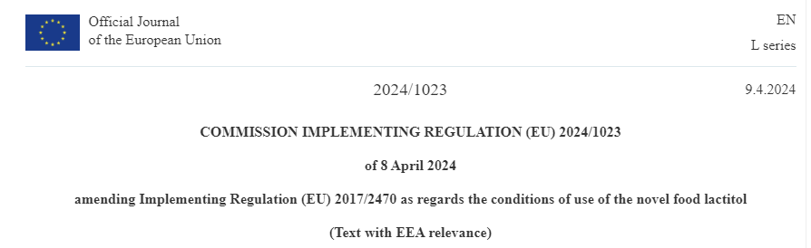 On April 9, 2024, the European Commission issued Implementing Regulation (EU) 2024/1023, amending the conditions of use of the novel food lactitol. This Regulation shall enter into force on the twentieth day following that of its publication in the Official Journal of the European Union.