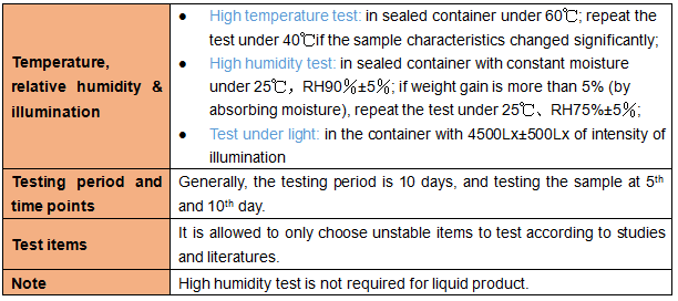 These stability experiments should be reasonably established and conducted depending on research purposes and product characteristics. Among them, the influencing factor test, accelerating test and long-term test are mandatory to conduct. While others could be selected to conduct, such as stability test while using, according to the specific characteristics of the product.