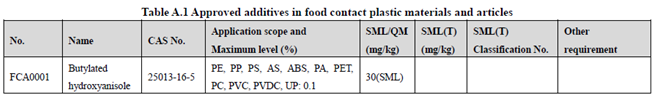 GB 9685-2016 takes the place of GB 9685-2008, and includes 1294 approved food contact additives. It specifies the principles for uses of additives in FCM, approved additive categories, application scope, and maximum permitted level, specific migration limit or maximum residue limit, total specific migration limit and other restrictions of the additives in FCM. Compared to the 2008 version, the additives and their usage requirements in the new version are listed separately in Table A.1 to Table A.7 of Annex A according to the category of the applicable scope. Take one additive - Butylated hydroxyanisole (CAS No. 25013-16-5) for example as following: