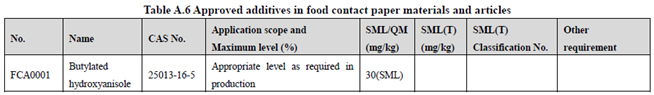 According to the information in the above Tables, Butylated hydroxyanisole (CAS No. 25013-16-5) is permitted in food contact plastic, coating, rubber, adhesive, and paper, but is not allowed in food contact ink or others. Meanwhile, it could be noted that the maximum level of Butylated hydroxyanisole in different FCM is different.