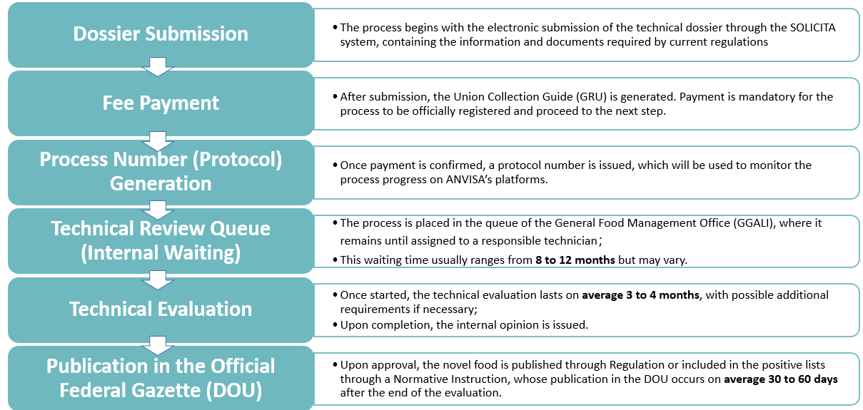 Based on experience, the ANVISA official review process for novel foods typically requires 12-18 months from dossier submission to publication in DOU. However, pre-assessment phases (including queue time and preliminary screening) exhibit significant variability, primarily depends on ANVISA’s internal workload.