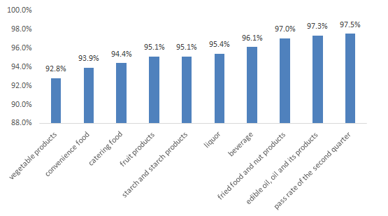 The average pass rate of food sampling in the second quarter of 2018 is 97.5%, which is used as a benchmark, the following figure shows the pass rate of the 9 food categories below this level:
