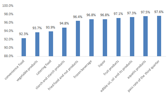The average pass rate of food sampling in the third quarter of 2018 is 97.6%, which is used as a benchmark, the following figure shows the pass rate of the 10 food categories below this level: