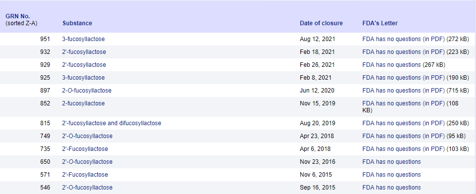 To date, several 2'-FL (single ingredient or combination products) have been approved by FDA as "Generally recognized as safe" (GRAS) substances. The scope of use includes infant formula milk powder and baked goods, dairy products, beverages and other general food categories; the amount of use varies according to different units.