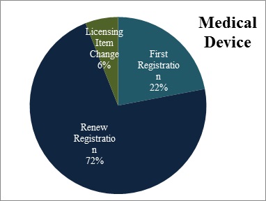 CFDA has accepted 9396 applications of medical device registration, in which: 2402 first registration applications, 5105 renew registration applications, and 1889 applications of licensing item change. A 6.7% reduction compared to the application number of 2014