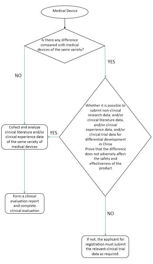 For imported medical devices that are clinically tested abroad, if their clinical trials meet the relevant Chinese technical requirements and regulations (such as sample size, control group selection, evaluation indicators and evaluation principles, and efficacy evaluation indicators), then, when registering, the registration applicant may submit the clinical trial data submitted to the overseas medical device authority when it is listed overseas. The information should include at least the ethics committee's comments, clinical trial protocols, and clinical trial reports. Applicants are also required to submit supporting data to demonstrate whether the clinical performance and/or safety of the product has ethnic differences.