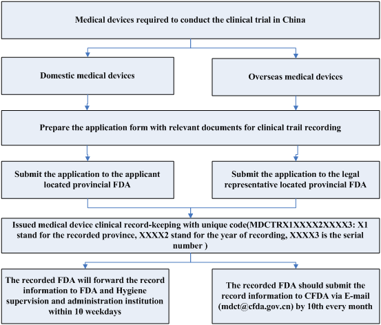 The clinical trials for domestic medical devices are required to record in the applicant located provincial FDA, in contrast, the clinical trials for overseas medical devices are required to record in its legal representative located provincial FDA. After received the clinical trial notification, the provincial FDA will issue the record-keeping with the code for the qualified application.